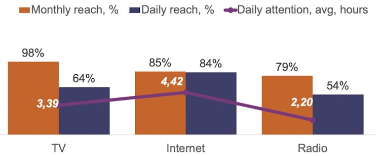 テレビなどの従来のメディア ソースには引き続き多くの視聴者がいます。テレビの月間リーチは 98%、ラジオの月間リーチは 79% です。(リーチとは、特定の期間中に少なくとも 1 回、媒体に曝露されたさまざまな人々または世帯の総数です)。